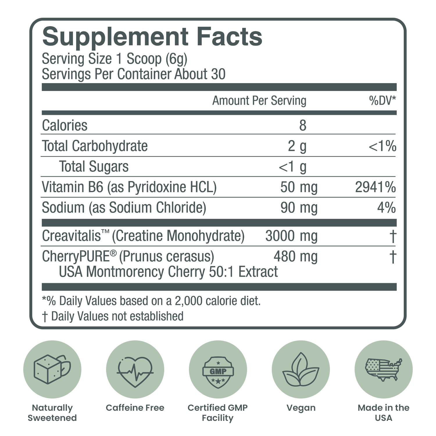 THE CREATINE-BASED DRINK FOR EVERY BODY: Boost your brain health, strength, and muscle recovery with a powerful blend of premium creatine, tart cherry extract, and a generous dose of vitamin B6.